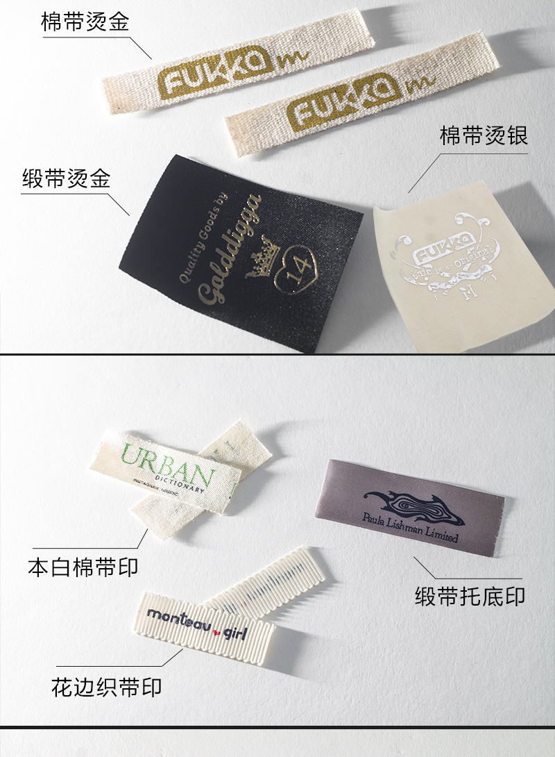 ——印嘜布標(biāo):廣東服裝印嘜廠家通過油墨印刷來表達(dá)文字,圖案及LOGO??刹捎玫牟牧戏浅V泛。有棉帶,絲帶,緞帶,膠帶等等。作為服裝的嘜頭(也叫作領(lǐng)標(biāo),主嘜,主標(biāo),領(lǐng)嘜),一般用棉帶與緞帶。