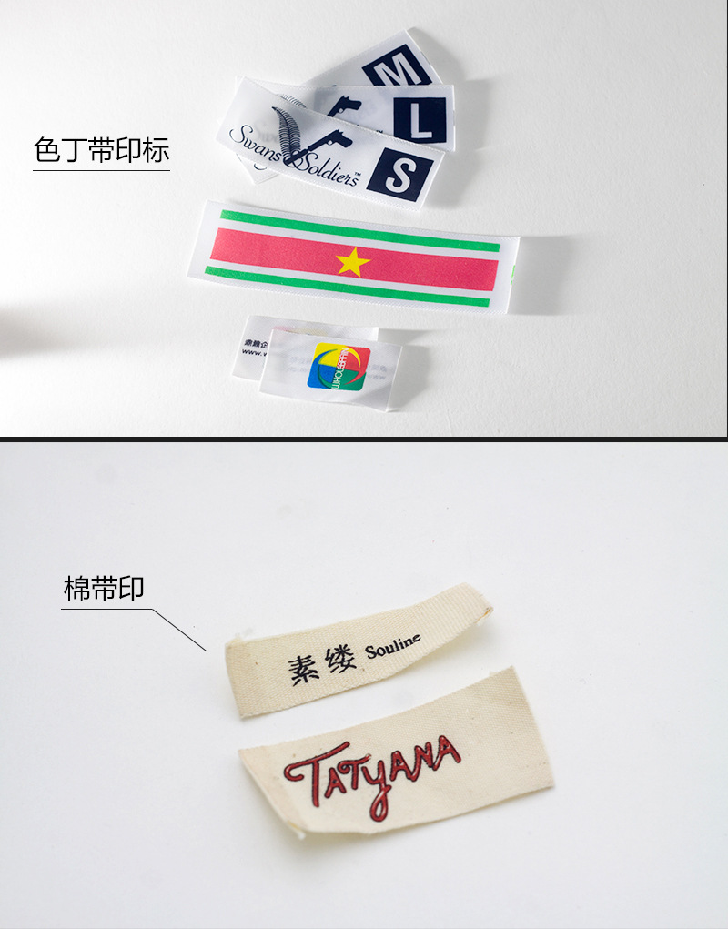 印嘜布標(biāo):廣東服裝印嘜廠家通過油墨印刷來表達(dá)文字,圖案及LOGO??刹捎玫牟牧戏浅V泛。有棉帶,絲帶,緞帶,膠帶等等。作為服裝的嘜頭(也叫作領(lǐng)標(biāo),主嘜,主標(biāo),領(lǐng)嘜),一般用棉帶與緞帶。